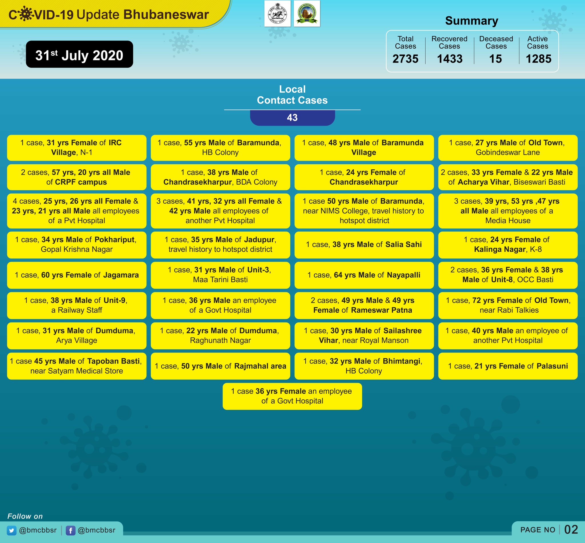 ଉଲ୍ଲେଖଯୋଗ୍ୟ, ଭୁବନେଶ୍ୱରରେ ମୋଟ୍ ୨୭୩୫ କରୋନା ପଜିଟିଭ ମାମଲା ରହିଛି । ତନ୍ମଧ୍ୟରୁ ବର୍ତ୍ତମାନ ସୁଦ୍ଧା ୧୨୮୫ଟି ସକ୍ରିୟ ମାମଲା ରହିଥିବା ବେଳେ ମୋଟ୍ ୧୪୩୩ ଜଣ ଆରୋଗ୍ୟ ଲାଭ କରିଛନ୍ତି । ଏହାଛଡା ୧୫ ଜଣଙ୍କର ମୃତ୍ୟୁ ଘଟିଛି ।
