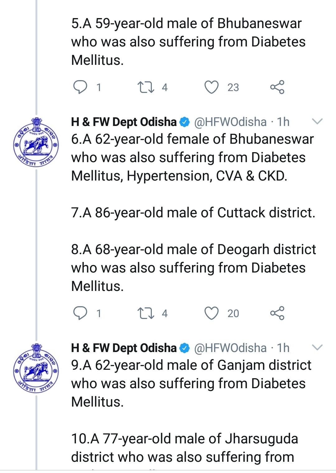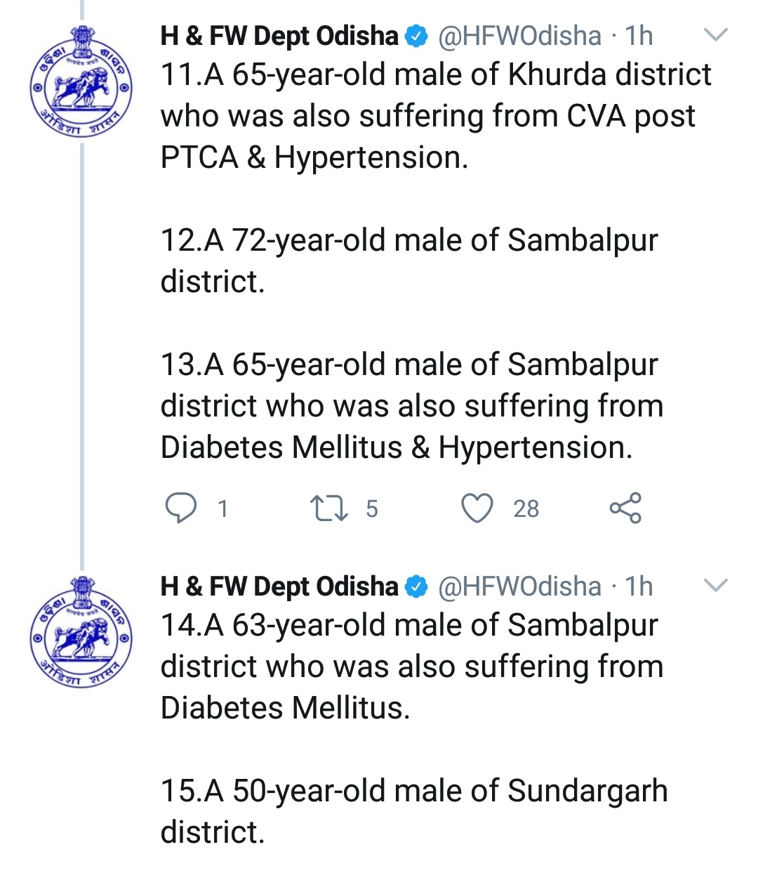 ସ୍ୱାସ୍ଥ୍ୟ ବିଭାଗର ଟ୍ୱିଟ୍ ଅନୁଯାୟୀ ବରଗଡରୁ ୨, ବଲାଙ୍ଗିରରୁ ୨, ଭୁବନେଶ୍ୱରରୁ ୨, କଟକରୁ ୧, ଦେବଗଡରୁ ୧, ଗଞ୍ଜାମରୁ ୧, ଝାରସୁଗୁଡାରୁ ୧, ଖୋର୍ଦ୍ଧାରୁ ୧, ସମ୍ବଲପୁରରୁ ୩ ଓ ସୁନ୍ଦରଗଡରୁ ଜଣେ କରୋନା ଆକ୍ରାନ୍ତର ମୃତ୍ୟୁ ଘଟିଛି।