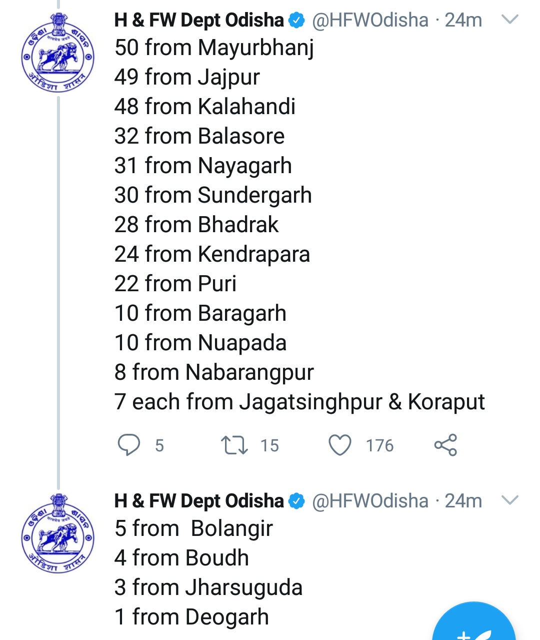 ଏନେଇ ଟ୍ୱିଟ୍ କରିଛନ୍ତି ରାଜ୍ୟ ସ୍ୱାସ୍ଥ୍ୟ ଓ ପରିବାର କଲ୍ୟାଣ ବିଭାଗ ।