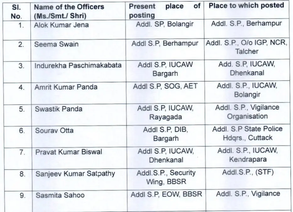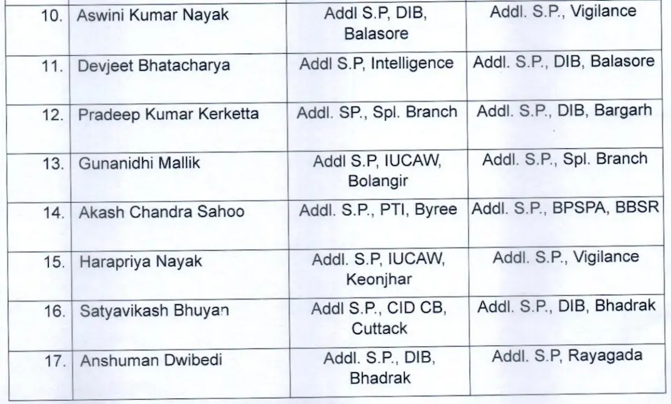 ସେହିପରି ସୌରଭ ଓଟ୍ଟାଙ୍କୁ କଟକର ରାଜ୍ୟ ପୋଲିସ ମୁଖ୍ୟାଳୟକୁ ବଦଳି କରାଯାଇଛି। ଇନ୍ଦୁରେଖା ପଶ୍ଚିମକବାଟଙ୍କୁ ଢେଙ୍କାନାଳର ଆଇୟୁସିଏଡବ୍ଲୁ ଅତିରିକ୍ତ ଏସ୍ପି ଏବଂ ଅମ୍ରିତ କୁମାର ପଣ୍ଡାଙ୍କୁ ବଲାଙ୍ଗୀରର ଆଇୟୁସିଏଡବ୍ଲୁ ଅତିରିକ୍ତ ଏସ୍ପି ଭାବରେ ନିଯୁକ୍ତି ଦିଆଯାଇଛି।