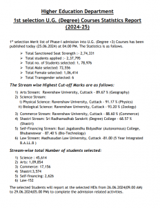 ବିଜ୍ଞାନରେ ନାମ ଲେଖାଇବାକୁ ୪୫,୬୧୪ ଜଣ ଛାତ୍ରଛାତ୍ରୀ ମନୋନୀତ ହୋଇଥିବା ବେଳେ କଳାରେ ୧,୦୯,୮୫୪ ଜଣ, ବାଣିଜ୍ୟରେ ୧୭,୧୫୬, ଶାସ୍ତ୍ରୀରେ ୩,୫୭୪, ସେଲ୍‌ଫ ଫାଇନାସିଂରେ ୨୬୨୬ ଓ ଆଇନରେ ୧୫୨ ଜଣ ନାମ ଲେଖାଇବାକୁ ମନୋନୀତ ହୋଇଛି। ଯୋଗ୍ୟ ଛାତ୍ରଛାତ୍ରୀଙ୍କ ନାମଲେଖା ଆସନ୍ତା ୨୬ ତାରିଖରୁ ୨୯ ତାରିଖ ଯାଏଁ ହେବ । ଜୁଲାଇ ୫ରେ ଦ୍ୱିତୀୟ ପର୍ଯ୍ୟାୟ ମେରିଟ ଲିଷ୍ଟ ତଥା କଟ୍ ଅଫ୍ ମାର୍କ ତାଲିକା ପ୍ରକାଶ ପାଇବ । ଜୁଲାଇ ୬ରୁ ୯ ମଧ୍ୟରେ ନାମଲେଖା ହେବ । ଜୁଲାଇ ୧୫ରେ ତୃତୀୟ ପର୍ଯ୍ୟାୟ ମେରିଟ୍ ଲିଷ୍ଟ ପ୍ରକାଶ ପାଇବା ।