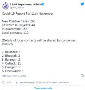 କଟକରୁ ୨୧ ଜଣ, ଯାଜପୁରରୁ ୧୦ ଜଣ, ସମ୍ବଲପୁର ଓ ଗଜପତି ଜିଲ୍ଲାରୁ ୯ ଜଣ ଲେଖାଁଏ, ବାଲେଶ୍ବର, ଦେବଗଡ଼ ଓ ପୁରୀ ଜିଲ୍ଲାରୁ ୭ ଜଣ ଲେଖାଁଏ, ସମ୍ବଲପୁରରୁ ୬ ଜଣ, ଢ଼େଙ୍କାନାଳରୁ ୫ ଜଣ, ମୟୂରଭଞ୍ଜରୁ ୪ ଜଣ, ଗଞ୍ଜାମରୁ ୩ ଜଣ, ଭଦ୍ରକ, ବଲାଙ୍ଗୀର, ଜଗତସିଂହପୁର, କେନ୍ଦ୍ରାପଡ଼ା ଓ ନବରଙ୍ଗପୁର ଜିଲ୍ଲାରୁ ୨ ଜଣ ଲେଖାଁଏ, ଝାରସୁଗୁଡ଼ା ଓ କୋରାପୁଟ ଜିଲ୍ଲାରୁ ଜଣେ ଲେଖାଁଏ ରହିଛନ୍ତି ।ରାଜ୍ୟରେ ୧୦ ଲକ୍ଷ ୪୪ ହଜାର ୯୬୨ ଜଣ ପଜିଟିଭ ଚିହ୍ନଟ ହୋଇଛନ୍ତି। ଏମାନଙ୍କ ଭିତରୁ ୧୦ ଲକ୍ଷ ୩୩ ହଜାର ୬୫୨ ଜଣ ସୁସ୍ଥ ହୋଇଛନ୍ତି। ଏବେ ବି ୨ ହଜାର ୯୩୨ ଜଣ ସକ୍ରିୟ ସଂକ୍ରମିତ ଅଛନ୍ତି।