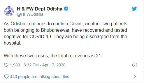 ଏମାନଙ୍କୁ ମିଶାଇ ମୋଟ ୨୧ ଜଣ କରୋନା ପଜିଟିଭ ଚିକିତ୍ସା ପରେ ସୁସ୍ଥ ହୋଇଛନ୍ତି । ଏମାନଙ୍କ ମଧ୍ୟରୁ ୧୨ ଜଣ ଭୁବନେଶ୍ୱରର ।