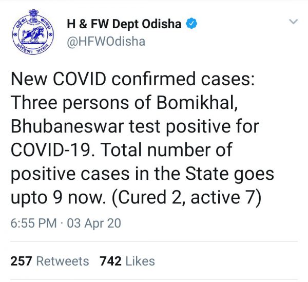 ଭୁବନେଶ୍ୱର: ରାଜଧାନୀର ବମିଖାଲ ଅଂଚଳରେ ତିନି ଜଣ ବ୍ୟକ୍ତି କରୋନା ପଜିଟିଭ ଚିହ୍ନଟ ହେବା ସହିତ ଓଡିଶାରେ କରୋନା ପଜିଟିଭଙ୍କ ସଂଖ୍ୟା ୯ରେ ପହଞ୍ଚିଛି । ରାଜ୍ୟ ସ୍ୱାସ୍ଥ୍ୟ ଓ ପରିବାର କଲ୍ୟାଣ ବିଭାଗ ପକ୍ଷରୁ ଟ୍ୱିଟରରେ ଏହି ସୂଚନା ଦିଆଯାଇଛି ।
