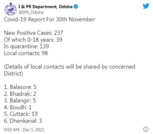 ଭୁବନେଶ୍ୱର: ରାଜ୍ୟରେ ଗତ ୨୪ ଘଣ୍ଟା ମଧ୍ୟରେ ୨୩୭ କରୋନା ପଜିଟିଭ୍ ଚିହ୍ନଟ ହୋଇଛନ୍ତି । ଏହାକୁ ମିଶାଇ ୧୦୪୯୩୪୫ରେ ପହଞ୍ଚିଲା ପଜିଟିଭ୍ ସଂଖ୍ୟା ।
