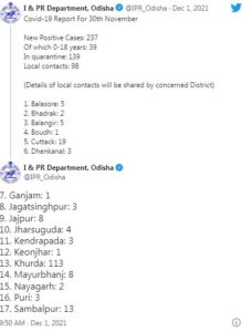 ଚିହ୍ନଟ ହୋଇଥିବା ସଂକ୍ରମିତଙ୍କ ମଧ୍ୟରୁ ବାଲେଶ୍ବର ଜିଲ୍ଲାରୁ ୫ଜଣ, ଭଦ୍ରକ ଜିଲ୍ଲାରୁ ୨ଜଣ, ବଲାଙ୍ଗୀର ଜିଲ୍ଲାରୁ ୫ଜଣ, ବୌଦ୍ଧ ଜିଲ୍ଲାରୁ ଜଣେ, କଟକ ଜିଲ୍ଲାରୁ ୧୯ଜଣ, ଢେଙ୍କାନାଳ ଜିଲ୍ଲାରୁ ୩ଜଣ, ଗଞ୍ଜାମ ଜିଲ୍ଲାରୁ ଜଣେ, ଜଗତସିଂହପୁର ଜିଲ୍ଲାରୁ ୩ଜଣ, ଯାଜପୁର ଜିଲ୍ଲାରୁ ୮ଜଣ, ଝାରସୁଗୁଡ଼ା ଜିଲ୍ଲାରୁ ୪ଜଣ, କେନ୍ଦ୍ରାପଡ଼ା ଜିଲ୍ଲାରୁ ୩ଜଣ, କେନ୍ଦୁଝର ଜିଲ୍ଲାରୁ ଜଣେ, ଖୋର୍ଦ୍ଧା ଜିଲ୍ଲାରୁ ୧୧୩ଜଣ, ମୟୁରଭଞ୍ଜ ଜିଲ୍ଲାରୁ ୮ଜଣ, ନୟାଗଡ଼ ଜିଲ୍ଲାରୁ ୨ଜଣ, ପୁରୀ ଜିଲ୍ଲାରୁ ୩ଜଣ, ସମ୍ବଲପୁର ଜିଲ୍ଲାରୁ ୧୩ଜଣ, ସୁନ୍ଦରଗଡ ଜିଲ୍ଲାରୁ ୧୬, ଷ୍ଟେଟ ପୁଲ୍ ରୁ ୨୭ ରହିଛନ୍ତି ।