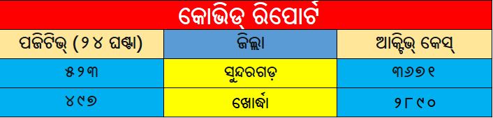 ସେକେଣ୍ଡ ଓ୍ୱେଭରେ ସୁନ୍ଦରଗଡ଼ ପରେ ଦ୍ୱିତୀୟ ସର୍ବାଧିକ ସଂକ୍ରମିତ ଜିଲ୍ଲା ଖୋର୍ଦ୍ଧା । ଗତ ୨୪ ଘଣ୍ଟାରେ ଖୋର୍ଦ୍ଧାରୁ ୪୯୭ ପଜିଟିଭ୍ ବାହାରିଛନ୍ତି । ଏଠାରେ ଆକ୍ଟିଭ୍ କେସ୍ ସଂଖ୍ୟା ରହିଛି ୨ହଜାର ୮୯୦ ।
