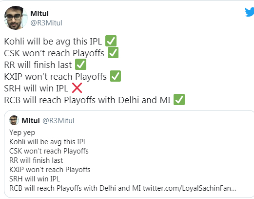 ଆବୁଧାବି: ଆଇପିଏଲର ଫାଇନାଲ ମ୍ୟାଚ ମଙ୍ଗଳବାର ମୁମ୍ବାଇ ଇଣ୍ଡିଆନ୍ସ ଓ ଦିଲ୍ଲୀ କ୍ୟାପିଟାଲ୍ସ ମଧ୍ୟରେ ଖେଳାଯିବ । ଏହା ପରେ ଚାମ୍ପିୟନ କିଏ ହେବ ଜଣାପଡିବ । ତେବେ ବର୍ତମାନ ସୋସିଆଲ ସାଇଟରେ ୪ ମାସ ତଳେ ଫଳାଫଳ ଭବିଷ୍ୟବାଣୀ କରିଥିବା ଜଣେ ବ୍ୟକ୍ତି ଏବେ ଚର୍ଚ୍ଚାରେ । ତାଙ୍କ ଟୁଇଟ ଏବେ ଭାଇରାଲ ହୋଇଛି । ୟୁଜରଙ୍କ ନାମ ମିତୁଲ । ସେ ୨୭ ଜୁଲାଇରେ ୬ଟି ଭବିଷ୍ୟବାଣୀ କରିଥିଲେ ତା ମଧ୍ୟରୁ ୫ଟି ଠିକ୍ ହୋଇଥିଲା । ଆସନ୍ତୁ ଜାଣିବା କଣ କଣ ସେ ଭବିଷ୍ୟବାଣୀ କରିଥିଲେ ।