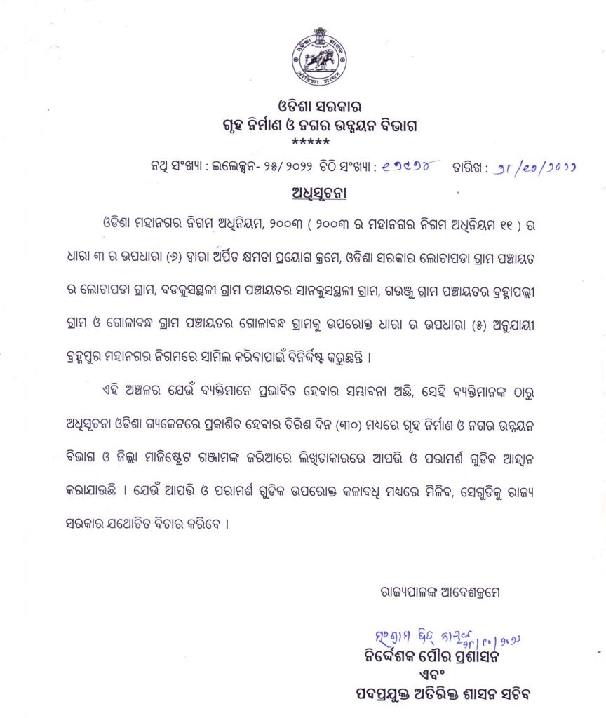 ବ୍ରହ୍ମପୁର:ବ୍ରହ୍ମପୁର ମହାନଗର ନିଗମରେ ସହର ଉପକଣ୍ଠ ୪ଟି ଗ୍ରାମ ମିଶ୍ରଣ ନେଇ ଆଶା ସଞ୍ଚାର ହୋଇଛି। ଶୁକ୍ରବାର ଏନେଇ ଗୃହ ନିର୍ମାଣ ଏବଂ ନଗର ଉନ୍ନୟନ ବିଭାଗ ତରଫରୁ ନୋଟିଫିକେସନ୍‌ ଜାରି ହୋଇଛି। ମିଶ୍ରଣ ହେବାକୁ ଥିବା ଗ୍ରାମଗୁଡ଼ିକ ହେଲା କୁକୁଡ଼ାଖଣ୍ଡି ବ୍ଲକର ଲୋଚାପଡ଼ା ଗ୍ରାମ, ରଙ୍ଗେଇଲୁଣ୍ଡା ବ୍ଲକର ବଡ଼କୁସସ୍ଥଳୀ ପଞ୍ଚାୟତର ସାନକୁସସ୍ଥଳୀ ଗ୍ରାମ ଏବଂ ଗଉଞ୍ଜୁ ପଞ୍ଚାୟତର ବ୍ରହ୍ମାପଲ୍ଲୀ ଗ୍ରାମ ଓ ଗୋଳାବନ୍ଧ ପଞ୍ଚାୟତର ଗୋଳାବନ୍ଧ ଗ୍ରାମ। ଏହି ଅଞ୍ଚଳର ଯେଉଁ ବ୍ୟକ୍ତିମାନେ ପ୍ରଭାବିତ ହେବାର ସମ୍ଭବନା ରହିଛି, ସେହି ବ୍ୟକ୍ତିମାନଙ୍କ ଠାରୁ ୩୦ ଦିନ ଭିତରେ ଗୃହ ନିର୍ମାଣ ଓ ନଗର ଉନ୍ନୟନ ବିଭାଗ ଓ ଜିଲା ମାଜିଷ୍ଟ୍ରେଟ୍‌ଙ୍କ ଜରିଆରେ ଲିଖିତ ଆପତ୍ତି ଓ ପରାମର୍ଶଗୁଡ଼ିକ ଆହ୍ବାନ କରାଯାଇଛି। ଯେଉଁ ଆପତ୍ତି ଓ ପରାମର୍ଶଗୁଡ଼ିକ ଉପରୋକ୍ତ ସମୟ ମଧ୍ୟରେ ମିଳିବ, ସେଗୁଡ଼ିକ ରାଜ୍ୟ ସରକାର ବିଚାର କରିବେ ବୋଲି ଏହି ନୋଟିଫିକେସନ୍‌ରେ ଉଲ୍ଲେଖ ରହିଛି। ପୌର ପ୍ରଶାସନ ନିର୍ଦେଶକ ସଂଗ୍ରାମଜିତ ନାୟକଙ୍କ ତରଫରୁ ଏହି ଅଧିସୂଚନା ଜାରି କରାଯାଇଛି।