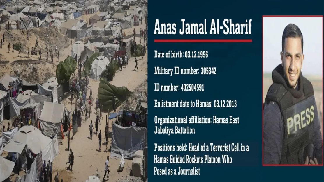 ଇସ୍ରାଏଲ ପ୍ରତିରକ୍ଷା ବାହିନୀ (ଆଇଡିଏଫ) ସୋସିଆଲ ମିଡିଆ ପ୍ଲାଟଫର୍ମ ଏକ୍ସରେ କହିଛି, ହମାସ ଆତଙ୍କବାଦୀ ଅନାସ ଅଲ୍-ଶରିଫ୍, ଯିଏ ନିଜକୁ ଅଲ୍ ଜାଜିରାର ସାମ୍ବାଦିକ ବୋଲି କହିଥିଲେ। ସେ ହମାସ ଆତଙ୍କବାଦୀ ଗୋଷ୍ଠୀର ମୁଖ୍ୟ ଥିଲେ ଏବଂ ଇସ୍ରାଏଲୀ ନାଗରିକ ଏବଂ ଆଇଡିଏଫ ସୈନିକଙ୍କ ଉପରେ ରକେଟ ଆକ୍ରମଣ କରିଥିଲେ। ଏହା ସହିତ, ଆଇଡିଏଫ କହିଛି, ଗାଜାରୁ ପ୍ରାପ୍ତ ଗୁପ୍ତ ତଥ୍ୟ ଏବଂ ଡକ୍ୟୁମେଣ୍ଟ, ଯେଉଁଥିରେ ରୋଷ୍ଟର, ଆତଙ୍କବାଦୀ ତାଲିମ ତାଲିକା ଏବଂ ଦରମା ରେକର୍ଡ ଅନ୍ତର୍ଭୁକ୍ତ। ଏସବୁ ପ୍ରମାଣ କରେ ଯେ ସେ ଅଲ୍ ଜଜିରା ସହିତ ଜଡିତ ଜଣେ ହମାସ କର୍ମୀ ଥିଲେ। ପ୍ରେସ୍ ବ୍ୟାଜ୍ ଆତଙ୍କବାଦ ପାଇଁ ଢାଲ ହୋଇପାରିବ ନାହିଁ।
