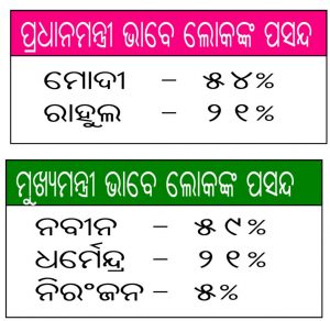 କିନ୍ତୁ ଅନ୍ୟପକ୍ଷରେ ଓଡ଼ିଶାର ୫୪ % ଜନସାଧାରଣ ଆସନ୍ତା ସାଧାରଣ ନିର୍ବାଚନରେ ଦେଶର ପ୍ରଧାନମନ୍ତ୍ରୀ ଭାବେ ନରେନ୍ଦ୍ର ମୋଦିଙ୍କ ସପକ୍ଷରେ ନିଜର ସମର୍ଥନ ଜଣାଇଛନ୍ତି । ସେହିପରି କଂଗ୍ରେସ ସଭାପତି ରାହୁଲ ଗାନ୍ଧୀଙ୍କୁ ୨୧% ଜନତା ପ୍ରଧାନମନ୍ତ୍ରୀ ଭାବେ ଦେଖିବାକୁ ଚାହାନ୍ତି ।