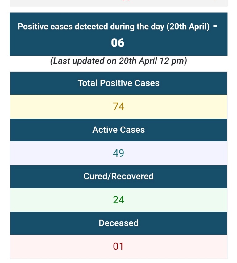 ଆଜି ଗୋଟିଏ ଦିନରେ ଓଡ଼ିଶାରେ ୧୩ ଜଣ କରୋନା ପଜିଟିଭ ଚିହ୍ନଟ ହୋଇଛନ୍ତି । ସାକଳୁ ୭ ଜଣ କରୋନା ପଜିଟିଭ ଚିହ୍ନଟ ହୋଇଥିଲେ । ୫ ଜଣ ଭଦ୍ରକ ଓ ୨ ବାଲେଶ୍ୱରର ଥିଲେ । ଓଡ଼ିଶାରେ ଏଯାଏଁ ମୋଟ ୭୪ ଜଣ କରୋନା ପଜିଟିଭ ଚିହ୍ନଟ ହୋଇଥିବା ବେଳେ ସେମାନଙ୍କ ମଧ୍ୟରୁ ୨୪ ଜଣ ସୁସ୍ଥ ହୋଇଛନ୍ତି ଓ ଜଣଙ୍କ ମୃତ୍ୟୁ ହୋଇଛନ୍ତି । ଅନ୍ୟ ୪୯ ଜଣଙ୍କ ବିଭିନ୍ନ ହସ୍ପିଟାଲରେ ଚିକିତ୍ସା ଚାଲିଛି ।