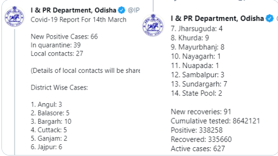 ଏନେଇ ରାଜ୍ୟ ସୂଚନା ଓ ଲୋକସଂପର୍କ ବିଭାଗ ପକ୍ଷରୁ ଟ୍ବିଟ୍ ଯୋଗେ ସୂଚନା ପ୍ରଦାନ କରାଯାଇଛି । ଚିହ୍ନଟ ହୋଇଥିବା ସଂକ୍ରମିତଙ୍କ ମଧ୍ୟରୁ ୩୯ ଜଣ କ୍ବାରେଣ୍ଟାଇନ୍ରେ ରହିଥିବା ବେଳେ ୨୭ ଜଣ ସ୍ଥାନୀୟ ବାସିନ୍ଦା ରହିଛନ୍ତି ।
