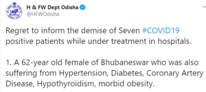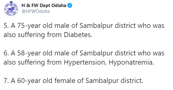 ମୃତକଙ୍କ ଭିତରେ ତିନି ଜଣ ମହିଳା ଓ ଚାରି ଜଣ ପୁରୁଷ ଅଛନ୍ତି । ସମସ୍ତଙ୍କ ବୟସ ୫୮ ବର୍ଷରୁ ୭୬ ବର୍ଷ ଭିତରେ । ଏମାନଙ୍କୁ ମିଶାଇ ରାଜ୍ୟରେ କରୋନା ମୃତ୍ୟୁସଂଖ୍ୟା ୪୪୮କୁ ବୃଦ୍ଧି ପାଇଛି ।