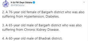 ସେହିପରି ଚିକିତ୍ସାଧୀନ ଅବସ୍ଥାରେ ବରଗଡ଼ ଜିଲ୍ଲାରୁ ଦୁଇ ଜଣ ପ୍ରାଣ ହରାଇଥିବା ବେଳେ ଭଦ୍ରକ ଓ ଭୁବନେଶ୍ୱରରେ ଜଣେ ଲେଖାଏଁ ସଂକ୍ରମିତ ମୃତ୍ୟୁବରଣ କରିଛନ୍ତି ।