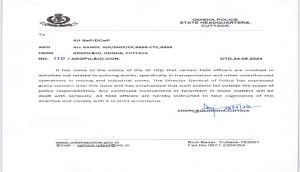 ଭୁବନେଶ୍ବର: ଆଜି ଏସପି ଓ ଡିସିପିଙ୍କୁ ଚିଠି ଲେଖିଛନ୍ତି ଏଡିଜି । ଯାହା ପୋଲିସ ବିଭାଗର ସାଙ୍ଘାତିକ ସତ୍ୟର ଗୁମର ଫିଟାଇ ଦେଇଛି । ଆଉ ଖଣି ଓ ଶିଳ୍ପାଞ୍ଚଳରେ ପରିବହନ କାର୍ଯ୍ୟରେ ପୋଲିସ ସହାୟତା କରୁଥିବା ସ୍ପଷ୍ଟ ବାରି ହୋଇପଡୁଛି ।