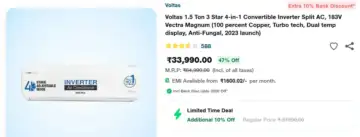 ଏହି ଏସିର ଦାମ ହେଉଛି 64 ହଜାର 990 ଟଙ୍କା। ହେଲେ ଜିଓମାର୍ଟରେ 47 ପ୍ରତିଶତ ଡିସକାଉଣ୍ଟ ସହ 33 ହଜାର 990 ଟଙ୍କରେ ଏହି ଏସି ମିଳୁଛି। କେବଳ ଏତିକି ନୁହେଁ ଏହି ଡିସକାଉଣ୍ଟ ଉପରେ ମଧ୍ୟ ଆହୁରି ଡିସକାଉଣ୍ଟ ରହିଛି। ଏଥିରେ 10 ପ୍ରତିଶତ ବ୍ୟାଙ୍କ ଡିସକାଉଣ୍ଟ ମଧ୍ୟ ରହିଛି। ଯଦି ଆପଣ ବରଦା କାର୍ଡରେ କିଣୁଛନ୍ତି ତେବେ ଏଥିରେ ଆପଣଙ୍କୁ 2,250 ଟଙ୍କା ଯାଏ ଅଫ ମିଳିଯିବ।