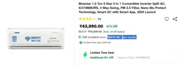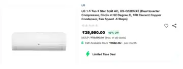 ଏଲଜିର ଏହି ଦେଢ଼ ଟନ୍ ଏସିର ଦାମ ରହିଛି 78 ହଜାର 990 ଟଙ୍କା। ହେଲେ ଏବେ ଜିଓମାର୍ଟରେ 49 ପ୍ରତିଶତ ଡିସକାଉଣ୍ଟ ସହ ଏହାର ଦାମ 39 ହଜାର 990 ଟଙ୍କା ହୋଇଯାଇଛି। ଆପଣ ଅନ୍ୟ ବ୍ୟାଙ୍କର କାର୍ଡ ବ୍ୟବହାର କରି ଏହି ଏସି କ୍ରୟ କରୁଛନ୍ତି ତେବେ ଆପଣଙ୍କପ 10 ପ୍ରତିଶତ ଆହୁରି ଡିସକାଉଣ୍ଟ ମିଳିପାରିବ। ହେଲେ ଏହି କାର୍ଡ ଅଫର 21 ଫେବୃଆରୀ ଯାଏ ରହିଛି।