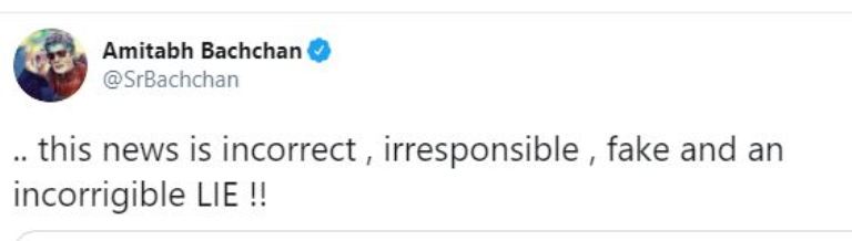 ମୁମ୍ୱାଇ: କୋଭିଡ୍ ରିପୋର୍ଟ ନେଗେଟିଭ୍ ଆସିଥିବା ଖବରକୁ ଖଣ୍ଡନ କରିଛନ୍ତି ଅମିତାଭ ବଚ୍ଚନ । ଏନେଇ ଟ୍ୱିଟ୍ କରିଛନ୍ତି ବିଗ ବି । ଏକ ଜାତୀୟ ଗଣମାଧ୍ୟମର ରିପୋର୍ଟକୁ ଟ୍ୟାଗ୍ କରି ଅମିତାଭ ବଚ୍ଚନ ଖବରକୁ ଭୁଲ୍ ଓ ଦାୟିତ୍ୱହୀନତା ବୋଲି ଲେଖିଛନ୍ତି । ମିଥ୍ୟା ଓ ସାଂଘାତିକ ମିଛ ବୋଲି କହିଛନ୍ତି ବିଗ ବି ।