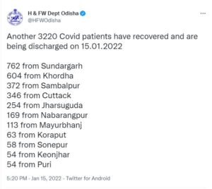 ଭୁବନେଶ୍ୱର: ରାଜ୍ୟରେ ଆଜି ୩୨୨୦ ଜଣ କରୋନା ସଂକ୍ରମିତ ସୁସ୍ଥ ହୋଇଛନ୍ତି । ସର୍ବାଧିକ ସୁନ୍ଦରଗଡ଼ ଜିଲ୍ଲାରୁ ଆଜି ୭୬୨ ଜଣ ସୁସ୍ଥ ହୋଇ ଥିବା ସ୍ୱାସ୍ଥ୍ୟ ଓ ପରିବାର କଲ୍ୟାଣ ବିଭାଗ ପକ୍ଷରୁ ସୂଚନା ଦିଆଯାଇଛି ।