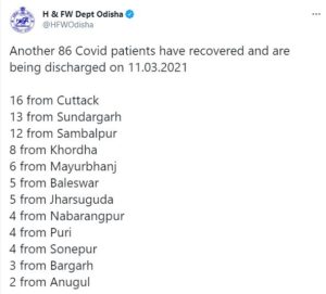 ଭୁବନେଶ୍ବର : ଆଜି ରାଜ୍ୟରୁ ସୁସ୍ଥ ହୋଇ ଘରକୁ ଫେରିଛନ୍ତି ୮୬ କରୋନା ଆକ୍ରାନ୍ତ । ସୁସ୍ଥ ହେବା ପରେ ସମସ୍ତଙ୍କୁ ହସପିଟାଲରୁ ଡିସଚାର୍ଜ କରାଯାଇଛି । କଟକରୁ ସର୍ବାଧିକ ୧୬ ଜଣ ସୁସ୍ଥ ହୋଇଥିବା ବେଳେ, ସୁନ୍ଦରଗଡ଼ରୁ ୧୩ ଜଣ ସୁସ୍ଥ ହୋଇ ଘରକୁ ଫେରିଛନ୍ତି ।