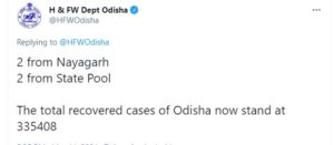ସେହିପରି ସମ୍ବଲପୁରରୁ ୧୨ ଜଣ ସୁସ୍ଥ ହୋଇ ଘରକୁ ଫେରିଥିବା ବେଳେ, ଖୋର୍ଦ୍ଧାରୁ ୮ ଜଣ, ମୟୂରଭଞ୍ଜରୁ ୬, ବାଲେଶ୍ବର ଓ ଝାରସୁଗୁଡ଼ାରୁ ୫ ଜଣ ଲେଖାଏଁ, ନବରଙ୍ଗପୁର, ପୁରୀ ଓ ସୋନପୁରରୁ ୪ ଜଣ ଲେଖାଏଁ, ବରଗଡ଼ରୁ ୩ ଜଣ, ଅନୁଗୁଳ, ନୟାଗଡ଼ ଓ ଷ୍ଟେଟ୍ ପୁଲରୁ ୨ ଜଣ ଲେଖାଏଁ ସୁସ୍ଥ ହୋଇ ଘରକୁ ଫେରିଛନ୍ତି । ଆଜିର ସଂଖ୍ୟାକୁ ମିଶାଇ ଏପର୍ଯ୍ୟନ୍ତ ରାଜ୍ୟରେ ସୁସ୍ଥ ହେଲେଣି ୩ ଲକ୍ଷ ୩୫ ହଜାର ୪୦୮ ଜଣ କରୋନା ଆକ୍ରାନ୍ତ ।