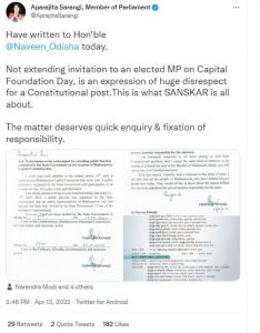 ସୂଚନା ଅନୁସାରେ ଆଜି ୭୪ ବର୍ଷରେ ପାଦ ଥାପିଛି ରାଜଧାନୀ ଭୁବନେଶ୍ୱର । ୭୪ ତମ ପ୍ରତିଷ୍ଠା ଦିବସରେ ଆଜି ସ୍ୱତନ୍ତ୍ର କାର୍ଯ୍ୟକ୍ରମର ଅନୁଷ୍ଠିତ ହୋଇଛି ।ଏଥିରେ ସମସ୍ତ ମନ୍ତ୍ରୀ ଓ ବିଧାୟକ , ମେୟର ଓ ସଚ୍ଚିବ ମାନଙ୍କୁ ନିମନ୍ତ୍ରଣ କରାଯାଇଥିଲା ।ହେଲେ ଭୁବନେଶ୍ୱର ସାଂସଦ ଅପରାଜିତା ଏଥରୁ ବାଦ୍ ପଡିଥିଲେ । ତାଙ୍କୁ କାହିଁକି ଡକାଗଲାନାହିଁ ବୋଲି ଟ୍ୱିଟ କିର ଜଣାଇଥିଲେ ଅପରାଜିତା ।ଏବେ ସାଂସଦ ଅପରାଜିତା ଷଡଙ୍ଗୀ ମୁଖ୍ୟମନ୍ତ୍ରୀ ନବୀନ ପଟ୍ଟନାୟକଙ୍କୁ ଚିଠି ଲେଖି ଜବାବ ମାଗିଛନ୍ତି ।