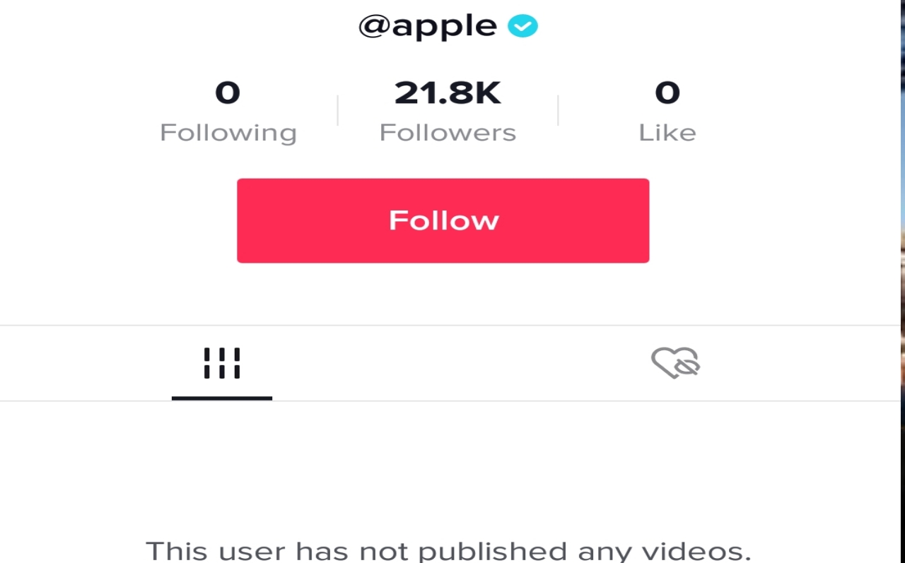 ଆପଲ୍ ଆକାଉଣ୍ଟକୁ ଟିକଟକ ୱେବସାଇଟ୍ କିମ୍ବା ଏହାର ଆପ୍ ରେ ଆକ୍ସେସ୍ କରାଯାଇପାରିବ | ଆପଲ୍ ଆକାଉଣ୍ଟ୍ ଅପେକ୍ଷାକୃତ ନୂତନ ଏବଂ ଖବର ଲେଖିବା ସମୟରେ ଏଥିରେ ମୋଟ ୨୧୮୦୦ ଅନୁସରଣକାରୀ ଥିବାବେଳେ କୌଣସି ଭିଡିଓ ପୋଷ୍ଟ କରାଯାଇ ନାହିଁ |