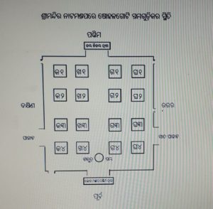 ନାଟ୍ୟ ମଣ୍ଡପର ମଧ୍ୟ ଭାଗରେ ଥିବା ଷୋହଳଗୋଟି ସ୍ତମ୍ଭର ଚତୁଃପାଶ୍ୱର୍ରେ ଥିବା ଭାସ୍କର୍ଯ୍ୟ ତଥା ଚିତ୍ରଣର ବିବରଣୀ ନିମ୍ନରେ ପ୍ରଦାନ କରାଗଲା । ପ୍ରଦତ୍ତ ନକ୍ସାର ଅନୁସରଣ କଲେ ବିବରଣୀ ପ୍ରାଞ୍ଜଳ ଭାବେ ବୁଝିହେବ ।