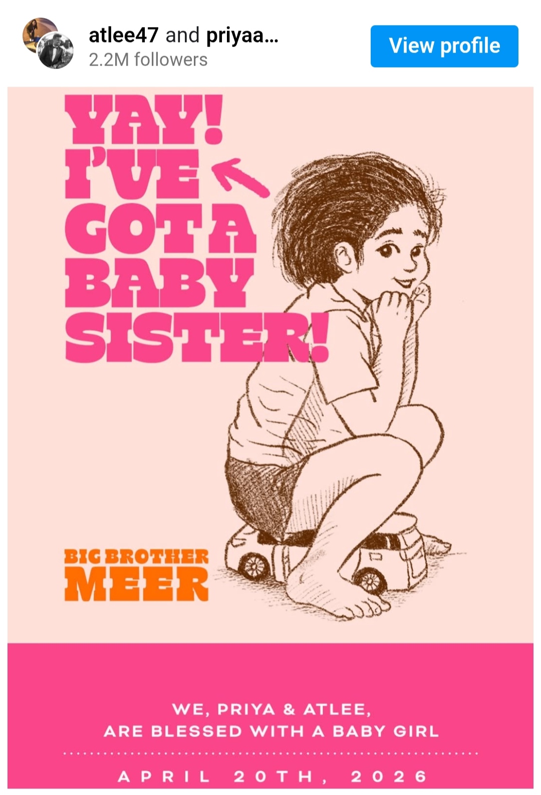 ଏହି ଦମ୍ପତି ଇନଷ୍ଟାଗ୍ରାମରେ ଏହି ଖୁସି ଖବର ସେୟାର କରିଛନ୍ତି। ଏକ ପୋଷ୍ଟରେ ଦେଖାଯାଉଛି ଗୋଟେ ଛୁଆ ଖେଳଣା ଗାଡ଼ିରେ ବସିଛି। ଆଉ ପୋଷ୍ଟରରେ ଲେଖା ଅଛି, ମୋର ଏକ ଛୋଟ ଭଉଣୀ ଅଛି! ବଡ଼ ଭାଇ, ମୀର।”