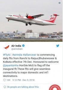ଏକ ଟ୍ୱିଟ ମାଧ୍ୟମରେ ଏୟାର ଲାଇନ୍ କର୍ତ୍ତୃପକ୍ଷ କହିଛନ୍ତି, କେନ୍ଦ୍ର ବେସାମରିକ ବିମାନ ଚଳାଚଳ ରାଷ୍ଟ୍ରମନ୍ତ୍ରୀ ଜୟନ୍ତ ସିହ୍ନା ଏହି ବିମାନ ଉଡାଣକୁ ଉଦଘାଟନ କରିବେ । ଏତଦ୍ ବ୍ୟତୀତ ଭୁବନେଶ୍ୱର ଛଡା କଲିକତା ଓ ରାୟପୁରକୁ ରାଞ୍ଚିରୁ ବିମାନ ଉଡାଣ ନେଇ ଘୋଷଣା ହୋଇଛି ।