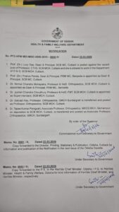 ସେହିପରି ଜ୍ୟୋତିଷ ଚନ୍ଦ୍ର ଚୌଧୁରୀ ହେଲେ ଏସ୍ସିବି ଏମ୍ସିଏଚ୍ ସୁପରିଟେଣ୍ଡେଣ୍ଟ। ବାରିପଦା ମେଡିକାଲ୍ କଲେଜର ଡିନ୍ ଓ ପ୍ରିନ୍ସିପାଲ୍ ହେଲେ ନିର୍ମଳ ମହାପାତ୍ର। ରାଜ୍ୟ ସ୍ୱାସ୍ଥ୍ୟ ଓ ପରିବାର କଲ୍ୟାଣ ବିଭାଗ ପକ୍ଷରୁ ବିଜ୍ଞପ୍ତି ପ୍ରକାଶ ପାଇଛି।