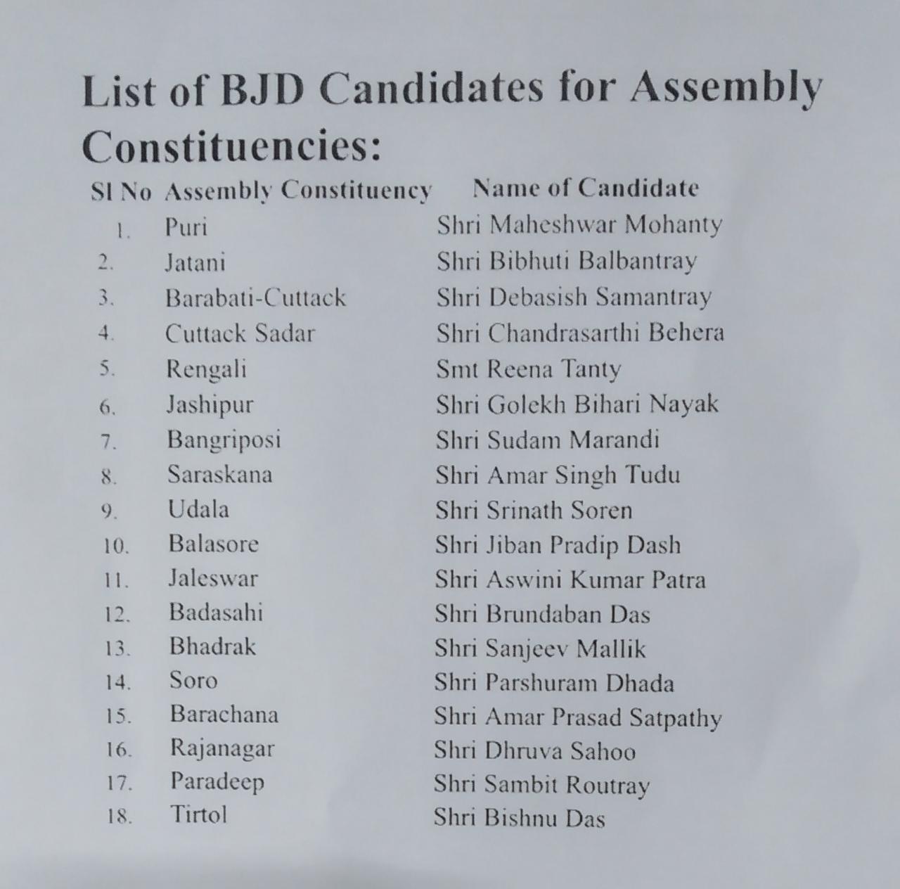 ବିଜେଡ଼ିର ୧୮ ବିଧାନସଭା ଆସନ ପ୍ରାର୍ଥୀ ତାଲିକା