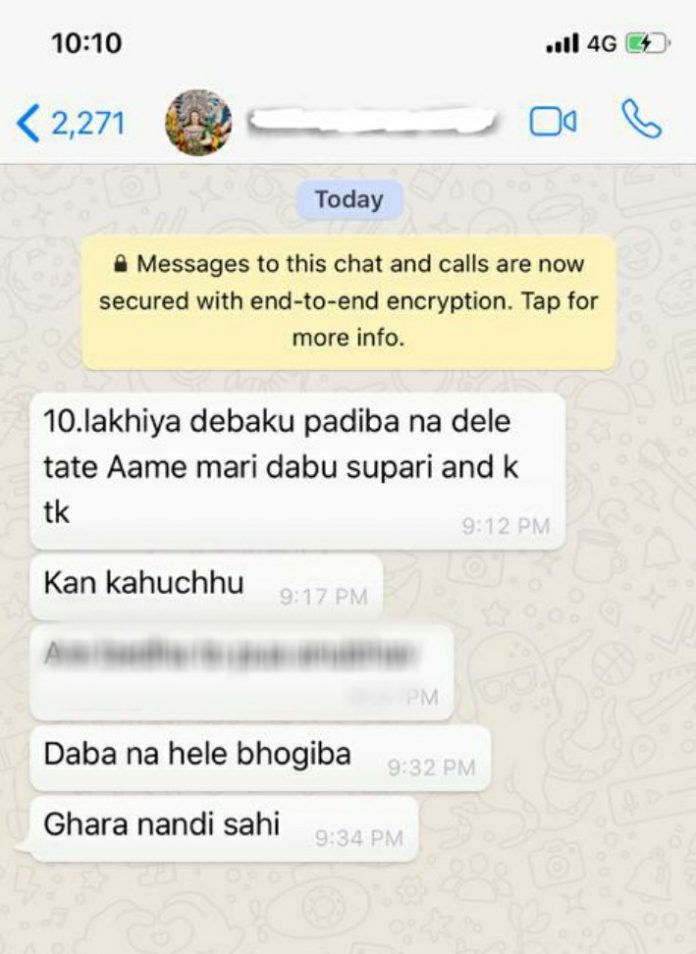 ଥାନାରେ ଦେଇଥିବା ଅଭିଯୋଗ ଅନୁଯାୟୀ, ତାଙ୍କର ଫୋନ ୱାଟସଆପରେ କେହି ଅଜଣା ବ୍ୟକ୍ତି ମେସେଜ୍ ମାଧ୍ୟମରେ ୧୦ ଲକ୍ଷ ଟଙ୍କା ନ’ଦେଲେ ଜୀବନରୁ ମାରିଦେବାର ଧମକ ଦେଇଛନ୍ତି ।