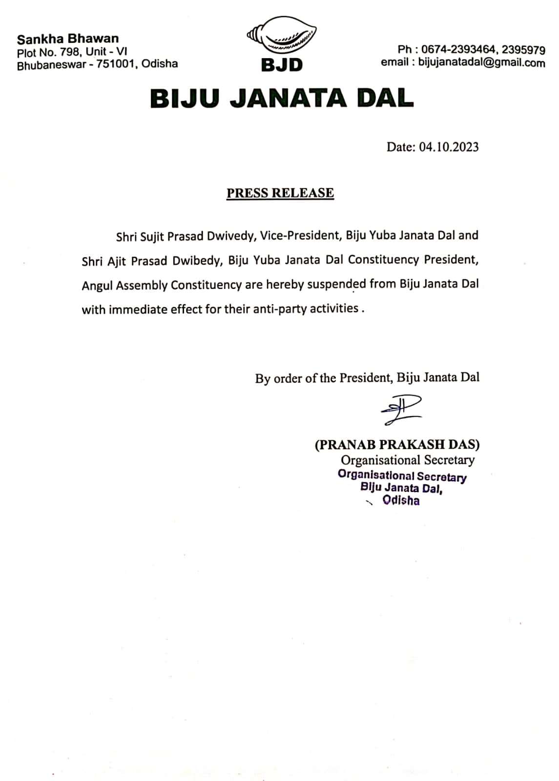 ଭୁବନେଶ୍ୱର:ବିଜୁ ଯୁବ ଜନତା ଦଳ (ବିଜେଡି) ପକ୍ଷରୁ ବୁଧବାର ୨ ଯୁବ ନେତାଙ୍କୁ ଦଳରୁ ନିଲମ୍ବିତ କରିଛନ୍ତି । ଦଳ ବିରୋଧୀ କାମ ପାଇଁ ତାଙ୍କୁ ନିଲମ୍ବିତ କରାଯାଇଛି । ଏହି ଦୁଇ ନେତା ହେଲେ ବିଜୁ ଯୁବ ଜନତା ଦଳର ଉପ ସଭାପତି ସୁଜିତ ପ୍ରସାଦ ଦ୍ୱିବେଦୀ ଏବଂ ବିଜୁ ଯୁବ ଜନତା ଦଳର ଅନୁଗୁଳ ବିଧାନସଭା ମଣ୍ଡଳୀର ସଭାପତି ଅଜିତ ପ୍ରସାଦ ଦ୍ୱିବେଦୀ । ଏ ନେଇ ଦଳ ପକ୍ଷରୁ ଏକ ପ୍ରେସ ବିଜ୍ଞପ୍ତିରେ ସୂଚନା ଦିଆଯାଇଛି ।