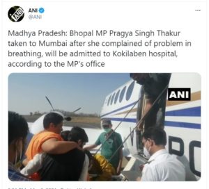 ଭୋପାଳ : ବିଗିଡିଲା ମଧ୍ୟପ୍ରଦେଶର ବିଜେପି ସାଂସଦ ଥିବା ସାଧ୍ବୀ ପ୍ରଜ୍ଞା ସିଂ ଠାକୁରଙ୍କ ସ୍ୱାସ୍ଥ୍ୟାବସ୍ଥା । ରକ୍ତଚାପ ବୃଦ୍ଧି ଏବଂ ଶ୍ବାସକ୍ରିୟାରେ କଷ୍ଟ ଅନୁଭବ କରିବାରୁ ତାଙ୍କୁ ସ୍ବତନ୍ତ୍ର ବିମାନରେ ମୁମ୍ବାଇର କୋକିଳାବେନ୍ ହସ୍ପିଟାଲରେ ଭର୍ତ୍ତି କରାଯାଇଛି । ଗତ ମାସରେ ମଧ୍ୟ ସ୍ବୀଧୀ ପ୍ରଜ୍ଞାଙ୍କ ସ୍ବାସ୍ଥ୍ୟାବସ୍ଥା ହଠାତ ବିଗିଡ଼ିବାରୁ ତାଙ୍କୁ ଡାକ୍ତରଖାନାରେ ଭର୍ତ୍ତି କରାଯାଇଥିଲା ।