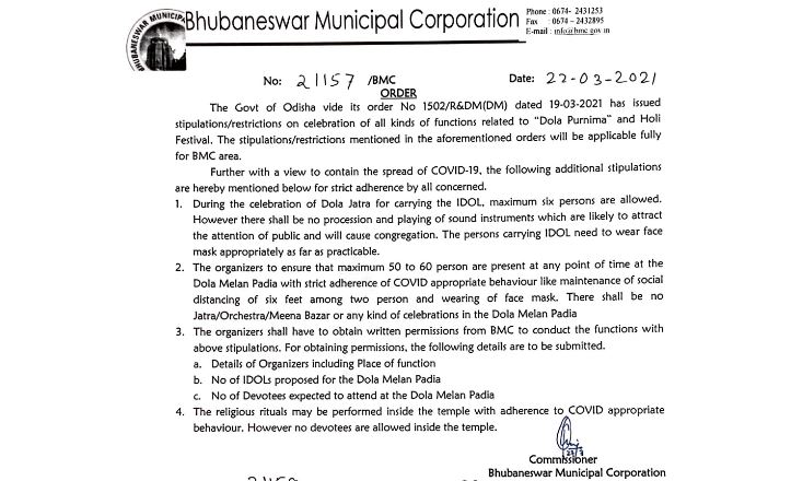 ଦୋଳ ପୂର୍ଣ୍ଣିମା ପାଇଁ ଆୟୋଜକ ବିଏମସିଠାରୁ ଲିଖିତ ଅନୁମତି ଆଣିବେ । ଯେଉଁଥିରେ ମେଲଣ ପଡ଼ିଆ ସ୍ଥାନ ଓ ଲୋକଙ୍କ ସମାଗମ ବିବରଣୀ ଦେବେ । କେତୋଟି ଦୋଳ ବିମାନ ଆସିବ ସେସମ୍ପର୍କରେ ତଥ୍ୟ ଦେବେ । କୋଭିଡ୍ କଟକଣାରେ ମନ୍ଦିରରେ ପାଳନ ହେବ ନୀତିକାନ୍ତି । ସେଠାରେ ଭକ୍ତଙ୍କ ପ୍ରବେଶକୁ ବାରଣ କରାଯାଇଛି ।