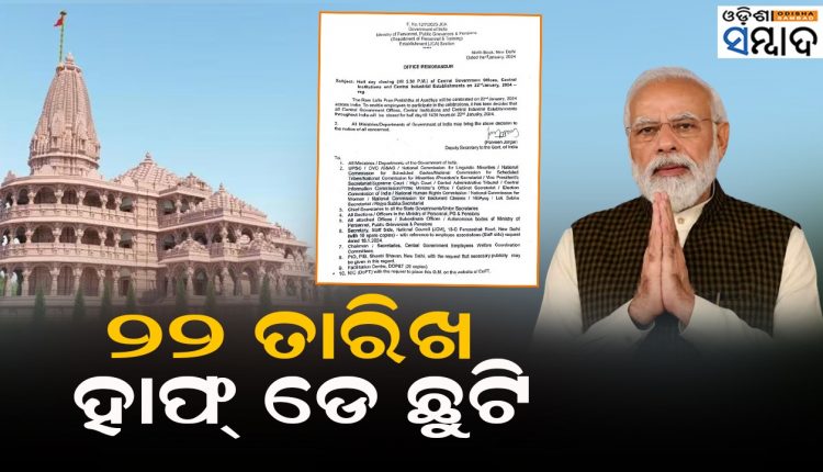 ସୂଚନା ଅନୁସାରେ, ଅଯୋଧ୍ୟାରେ ରାମଲାଲାଙ୍କ ପ୍ରାଣ ପ୍ରତୀଷ୍ଠା ପାଇଁ ଜାନୁଆରୀ ୨୨ରେ ସମସ୍ତ ସରକାରୀ କାର୍ଯ୍ୟାଳୟ ଦିନ ୨.୩୦ ପର୍ଯ୍ୟନ୍ତ ବନ୍ଦ ରହିବ । ସମସ୍ତ କର୍ମଚାରୀ କିଭଳି ଏହି ଉତ୍ସବରେ ଅଂଶଗ୍ରହଣ କରିବେ ଏହାକୁ ଦୃଷ୍ଟିରେ ରଖି କେନ୍ଦ୍ର ସରକାର ଏପରି ଏକ ନିଷ୍ପତି ନେଇଛନ୍ତି ।