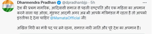 ତୃଣମୂଳ କଂଗ୍ରେସ ନେତା ଅଖିଳ ଗିରିଙ୍କ ଭିଡିଓ ଭାଇରାଲ ହେବା ପରେ ଦେଶବ୍ୟାପୀ ବିଜେପି ପକ୍ଷରୁ କଡା ସମାଲୋଚନା କରାଯାଉଛି । ବିଜେପି ନେତା ଶୁଭେନ୍ଦୁ ଅଧିକାରୀଙ୍କୁ ଟାର୍ଗେଟ୍ କରି ଭାଷଣ ଦେବା ବେଳେ ସେ ରାଷ୍ଟ୍ରପତିଙ୍କ ରୂପ ସମ୍ପର୍କରେ ପ୍ରଶ୍ନ ଉଠାଇଥିଲେ । ଏହାପରେ ପଶ୍ଚିମବଙ୍ଗ ବିଜେପି ଟ୍ୱିଟରରେ ଏକ ଭିଡିଓ ସେୟାର କରିଛି । ଯେଉଁଥିରେ ମୁଖ୍ୟମନ୍ତ୍ରୀ ମମତା ବାନାର୍ଜୀ ଓ ଟିଏମସିକୁ ଆଣ୍ଟି-ଟ୍ରାଇବାଲ୍ ବୋଲି ଉଲ୍ଲେଖ କରାଯାଇଛି ।