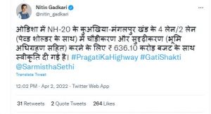 ଅନ୍ୟପଟେ ଏନଏଚ ୨୦ ସମ୍ପ୍ରସାରଣ ପାଇଁ ୬୩୬ .୧୦ କୋଟି ଟଙ୍କା ମଞ୍ଜୁର କରାଯାଇଛି । କୁଆଖିଆ ଠାରୁ ମଙ୍ଗଳପୁର ପର୍ଯ୍ୟନ୍ତ ଏନଏଚ ଷ୍ଟ୍ରେଚ ଉପରେ କାର୍ଯ୍ୟ ପାଣ୍ଠି ସହିତ ନିଆଯିବ । ୪ ଲେନ୍ କୁ ସମ୍ପ୍ରସାରଣ କରାଯିବ। କାର୍ଯ୍ୟରେ ବିନିଯୋଗ କରାଯିବ । ଏନେଇ ଟୁଇଟ୍ରେ କେନ୍ଦ୍ରମନ୍ତ୍ରୀ ଜଣାଇଛନ୍ତି ।