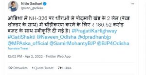 ନିତୀନ ଟ୍ୱିଟ କରି କହିଛନ୍ତି ଯେ ଜାତୀୟ ରାଜପଥ ୩୬୨ ଓ ୨୦ ପାଇଁ ଏହି ପାଣ୍ଠି ମଞ୍ଜୁର କରାଯାଇଛି । ମୋଟ ପାଣ୍ଠି ମଧ୍ୟରୁ ଏନଏଚ ୩୨୬ ରେ ଧାମନଗର ସମ୍ପ୍ରସାରଣ ପାଇଁ ୧୮୬ କୋଟି ଟଙ୍କା ମଞ୍ଜୁର କରାଯାଇଛି ।ଏହି ପାଣ୍ଠିକୁ ପକ୍କା ରାସ୍ତା ସହ ୨ ଲେନ ବିଶିଷ୍ଠ ରାଜପଥର ସମ୍ପ୍ରସାରଣ ପାଇଁ ବ୍ୟବହାର କରାଯିବ ବୋଲି ଗଡକରୀ କହିଛନ୍ତି ।
