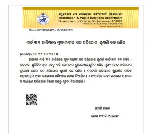ଭୁବନେଶ୍ବର: ଆସନ୍ତା ୩୧ତାରିଖରେ ବନ୍ଦ ରହିବ ମୁଖ୍ୟମନ୍ତ୍ରୀଙ୍କ ଜନ ଶୁଣାଣି ଅଭିଯୋଗ । ଉକ୍ତଦିନ ସରକାରୀ ଛୁଟି ଦିନ ଥିବା କାରଣରୁ ଭୁବନେଶ୍ବର, ୟୁନିଟ-୫ ସ୍ଥିତ ମୁଖ୍ୟମନ୍ତ୍ରୀଙ୍କ ଅଭିଯୋଗ ପ୍ରକୋଷ୍ଠ ଠାରେ ବନ୍ଦ ରହିବ ।