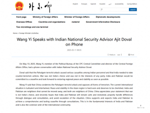 ଚୀନ୍ ବୈଦେଶିକ ମନ୍ତ୍ରଣାଳୟ ଅନୁଯାୟୀ, “ଡୋଭାଲ କହିଛନ୍ତି ଯେ ପହଲଗାମ୍ ଆତଙ୍କବାଦୀ ଆକ୍ରମଣରେ ଭାରତୀୟ କର୍ମଚାରୀଙ୍କ ମଧ୍ୟରେ ଗମ୍ଭୀର କ୍ଷତି ହୋଇଛି ଏବଂ ଭାରତକୁ ଦୃଢ଼ ଆତଙ୍କବାଦ ବିରୋଧୀ କାର୍ଯ୍ୟାନୁଷ୍ଠାନ ଗ୍ରହଣ କରିବାକୁ ପଡିବ । ଯୁଦ୍ଧ ଭାରତର ପସନ୍ଦ ନୁହେଁ ଏବଂ ଏହା କୌଣସି ପକ୍ଷର ସ୍ୱାର୍ଥରେ ନୁହେଁ । ଭାରତ ଏବଂ ପାକିସ୍ତାନ ଯୁଦ୍ଧବିରତି ପ୍ରତି ପ୍ରତିବଦ୍ଧ ରହିବେ ଏବଂ ଯଥାଶୀଘ୍ର ଆଞ୍ଚଳିକ ଶାନ୍ତି ଏବଂ ସ୍ଥିରତା ଫେରାଇ ଆଣିବାକୁ ଆଶା କରିବେ।”
