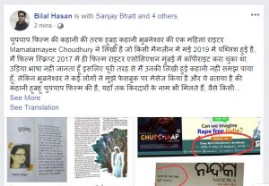 ସମାନ୍ତରାଳ ଭାବେ ବିଲାଲ ହାସନ ତାଙ୍କ ନିଜ ଟାଇମଲାଇନ୍ ରେ ପୋଷ୍ଟ କରିଛନ୍ତି ଯେ ‘ଚୁପଚାପ’ ଫିଲ୍ମର କାହାଣୀ ସହ ମିଶୁଥିବା ଏକ ଗପ ଭୁବନେଶ୍ୱରର ଜଣେ ଜଣାଶୁଣା ଲେଖିକା ଏକ ପତ୍ରିକାର ମେ ୨୦୧୯ ସଂଖ୍ୟାରେ ଲେଖିଛନ୍ତି । ସେ କିନ୍ତୁ ଫିଲ୍ମର କାହାଣୀଟି ୨୦୧୭ ମସିହାରେ ଲେଖିଥିଲେ ଓ ପରେ ‘ଫିଲ୍ମ ରାଇଟର୍ସ ଆସୋସିଏସନ୍’ରେ ପଂଜିକରଣ ମଧ୍ୟ କରିଥିଲେ। ଭୁବନେଶ୍ୱରର କେତେଜଣ ବନ୍ଧୁ ତାଙ୍କ ଫିଲ୍ମର କାହାଣୀ ସହ ଗଳ୍ପଟି ପୂରା ମିଶୁଛି ବୋଲି ମେସେଜ୍ ଦେଇଛନ୍ତି । ସେ ଓଡ଼ିଆ ପଢ଼ି ଜାଣିନଥିବାରୁ ଘଟଣାର ସତ୍ୟାସତ୍ୟ ଜାଣିପାରୁ ନାହାନ୍ତି । ତେବେ ତାଙ୍କ ଫିଲ୍ମର କାହାଣୀ ଚୋରିକରି କେହି ଗପ ଲେଖିଦେଲେ ତାଙ୍କର କିଛି ଯାଏଆସେ ନାହିଁ । ବରଂ ଚୋରି କରିଥିବା ଲେଖକ ଜାଣିବା ଦରକାର ଯେ ‘ଚୋରି କରନା ପାପ୍ ହୈ, ନଦୀ କିନାରେ ସାଂପ୍ ହୈ’ । ଆଉ ସେଇ ସାପ ଯୋଉଦିନ ଦଂଶିଦବ, ଅସୁବିଧା ହେଇଯିବ ବୋଲି ସେ ପରିହାସ କରିଛନ୍ତି।