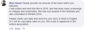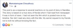 ଏଥିସହିତ ସେ ସୂଚନା ଦେଇଛନ୍ତି ଯେ ସେ ନିଜେ ଏହି ଫିଲ୍ମର କାହାଣୀକାର ଓ ନିର୍ଦେଶକ । କାହାଣୀଟି ୨୦୧୮ରେ ‘ଫିଲ୍ମ ରାଇଟର୍ସ ଆସୋସିଏସନ୍’ରେ ପଂଜୀକୃତ ହୋଇଛି । ଯଦି ମମତା କାହାଣୀର ଉତ୍ସ ସଂପର୍କରେ ସଠିକ୍ ପ୍ରମାଣ ନଦିଅନ୍ତି, ସେ କପିରାଇଟ୍ ଆକ୍ଟରେ ତାଙ୍କ ନାମରେ ଅଭିଯୋଗ ଆଣିବେ ।