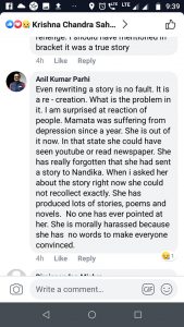 ଘଟଣାକ୍ରମରେ ମମତାମୟୀଙ୍କ ଲେଖକ-ସ୍ୱାମୀ ଅନୀଲ କୁମାର ପାଢ଼ୀ ଲେଖିକାଙ୍କ ସପକ୍ଷରେ ଫେସବୁକରେ ଯୁକ୍ତି ବାଢ଼ିଛନ୍ତି । ଯାହା ଘଟଣାକୁ ଏକ ନୂଆ ଅଥଚ ଅଜବ ମୋଡ଼ ଦେଇଛି । ସେ କହିବାକୁ ଚାହିଛନ୍ତି ଯେ ଲେଖିକା ତାଙ୍କ ପିତାଙ୍କ ଦେହାନ୍ତ ପରେ ମାନସିକ ଅବସାଦଗ୍ରସ୍ତ ହୋଇ ଚିକିତ୍ସିତ ହେଉଥିବାବେଳେ ଏ ଗଳ୍ପ ଲେଖିଛନ୍ତି । ସେତେବେଳେ ମମତା ହୁଏତ ୟୁଟ୍ୟୁବର ପ୍ରଭାବରେ ଆସିଥାଇ ପାରନ୍ତି, ଯାହା ତାଙ୍କର ମନେନାହିଁ । ଯଦି ଅଜାଣତରେ ସେ ଏପରି କରିଥାନ୍ତି, ପାଠକମାନେ ଏଥିପାଇଁ ତାଙ୍କୁ ଟ୍ରୋଲ୍ କରିବା ଉଚିତନୁହେଁ ।