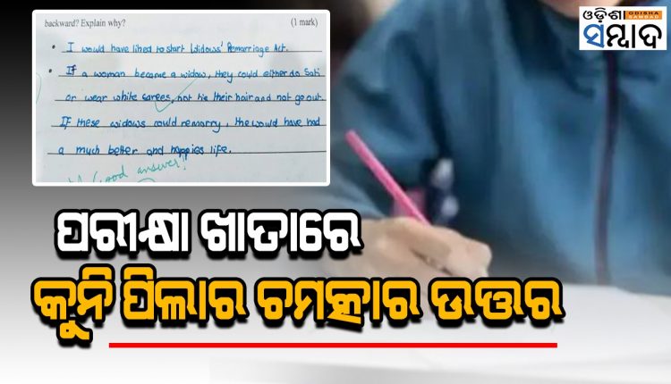 ଏହି ପ୍ରଶ୍ନର ଉତ୍ତରରେ କୁନ ପୁଅଟି ଲେଖିଥିଲା, ‘ମୁଁ ସେ ସମୟର ସମାଜ ସୁଧାରକ ହୋଇଥିଲେ ବିଧବା ବିବାହ ପ୍ରଥାକୁ ଆରମ୍ଭ କରିବାକୁ ଚାହିଁଥାନ୍ତି । ଯଦି ମହିଳା ଜଣେ ବିଧବା ହୋଇ ଯାଆନ୍ତି ତେବେ ତାଙ୍କୁ ଦୁଇଟି ବାଟ ବାଛି ନେବାକୁ ପଡିଥାଏ । ସତୀ ହେବେ ନଚେତ ଧଳା ଶାଢୀ ପିନ୍ଧିବେ। ସେମାନଙ୍କୁ ମୁଣ୍ଡ କୁଣ୍ଡାଇ ବାହାରକୁ ଯିବା ମନା । ଯଦି ବିଧବାଙ୍କର ପୁର୍ନବିବାହ ହୋଇ ପାରନ୍ତା ତେବେ ତାଙ୍କର ଜୀବନ ସୁଧୁରି ଯାଇଥାନ୍ତା । ସେମାନେ ଏକ ସୁନ୍ଦର ଜୀବନ ଜିଇଁ ପାରନ୍ତେ ।’ ପରୀକ୍ଷା ଖାତାରେ ବି ଶିକ୍ଷକ ବହୁତ ସୁନ୍ଦର ଉତ୍ତର ବୋଲି ଲେଖିଛନ୍ତି ।