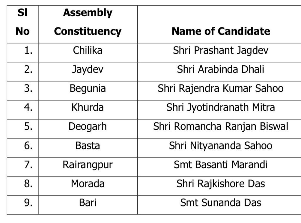 ୯ଟି ବିଧାନସଭା ଆସନ ପ୍ରାର୍ଥୀ ତାଲିକା ଘୋଷଣା