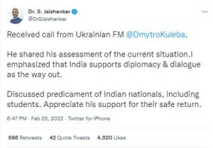 ଏହି ସମୟେରେ ୟୁକ୍ରେନରେ ବହୁ ଛାତ୍ରଛାତ୍ରୀଙ୍କ ସମେତ ଅନେକ ଶ୍ରମିକ ମଧ୍ୟ ଫସି ରହିଛନ୍ତି। ଭାରତୀୟ ମାନଙ୍କୁ ଉଦ୍ଧାର ପ୍ରସଙ୍ଗରେ ୟୁକ୍ରେନ ସହ କଥାବାର୍ତ୍ତା ଜାରି ରଖିଛନ୍ତି ବୈଦେଶୀକ ବ୍ୟାପାର ମନ୍ତ୍ରୀ । ସେମାନଙ୍କୁ ସୁରକ୍ଷିତ ଉଦ୍ଧାର ପାଇଁ ପ୍ରୟାସ ଜାରି ରହିଛି ବୋଲି ବୈଦେଶିକ ବ୍ୟାପାର ମନ୍ତ୍ରୀ ଟ୍ୱିଟ ଯୋଗେ ସୂଚନା ଦେଇଛନ୍ତି ।