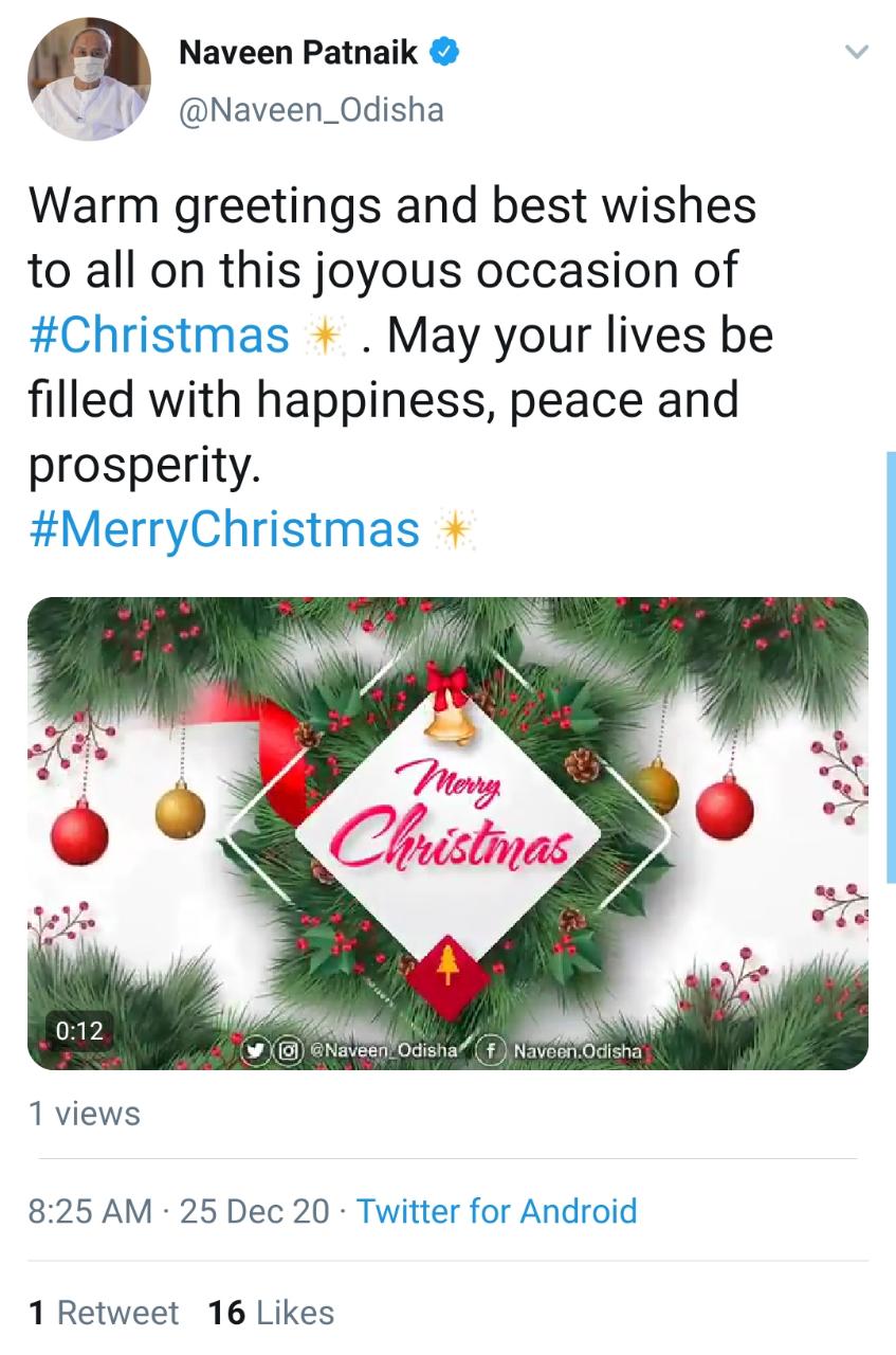 ଏହି ଅବସରରେ ମୁଖ୍ୟମନ୍ତ୍ରୀ ନବୀନ ପଟ୍ଟନାୟକ ଟୁଇଟ କରି ରାଜ୍ୟବାସୀଙ୍କୁ ବଡ଼ଦିନର ଶୁଭେଚ୍ଛା ଜଣାଇଛନ୍ତି। ‘‘ବଡ଼ଦିନରେ ସମସ୍ତଙ୍କ ଜୀବନ ଖୁସି, ଆନନ୍ଦ, ଶାନ୍ତିରେ ପରିପୂର୍ଣ୍ଣ ହେଉ ବୋଲୁ’’ ଟୁଇଟରେ ଲେଖିଛନ୍ତି ନବୀନ।